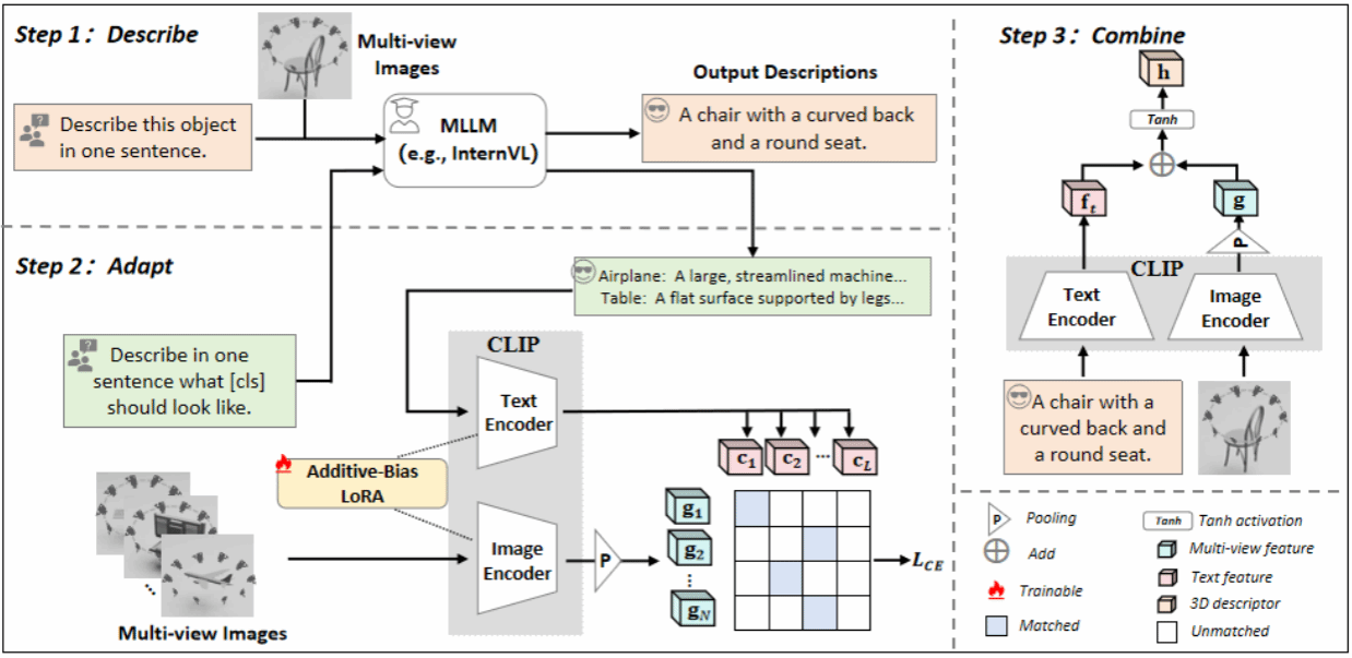 该研究聚焦于3D模型检索领域的前沿问题,创新性提出一种基于大规模预训练模型CLIP的轻量级适配框架——DAC,旨在解决开放场景下3D对象检索中的类别泛化难题。当前开放集3D对象检索方法通常依赖复杂的多模态输入(如点云、体素等)进行匹配与检索,而DAC则充分挖掘CLIP在自然图像上的强大表征能力,仅以多视角图像作为输入,并通过低秩适应(LoRA)策略进行高效微调。该过程仅需少量已知类别即可完成适配,显著提升了检索精度的同时也保证了方法的轻量化与实用性。同时为避免微调过程中对已知类别的过拟合,DAC引入了可学习且与输入无关的加性偏置(additive bias),从而在提升已知类检索性能的同时,有效保留模型对未知类别的泛化能力。此外,DAC进一步引入文本模态以辅助检索。具体而言,DAC借助多模态大模型为每个3D对象生成文本描述,这些描述提供了丰富的语义属性信息,显著增强了模型对未知类别的识别与特征匹配能力。