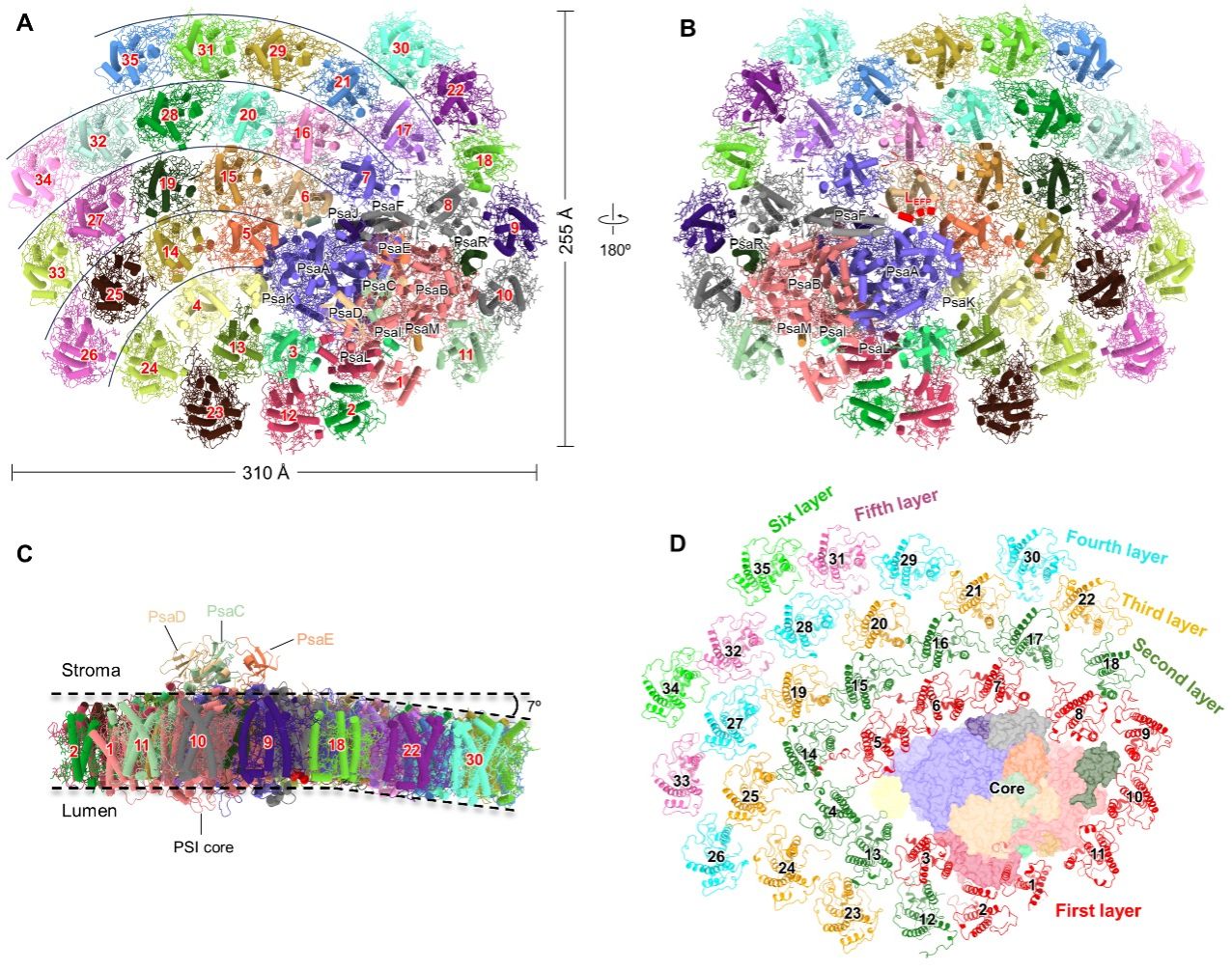浩瀚海洋中,单细胞颗石藻在全球碳循环和气候变化中具有重要生态功能,其显著特征为细胞表面覆盖碳酸钙构成的颗石粒。它们通过光合作用及颗石壳的碳沉积作用影响全球碳循环。颗石藻能够在全球海洋中广泛分布,其高效的光合适应机制是关键。颗石藻PSI-LHCI复合体结构尺寸巨大(310×255×100 ų),分子量高达1.54MDa。35个捕光天线高度有序排列,形成独特的性纤维状结构,极大地扩展了光捕获的面积。外层捕光天线的相似结构及延长的loop为超大规模天线系统的构建提供了结构基础。