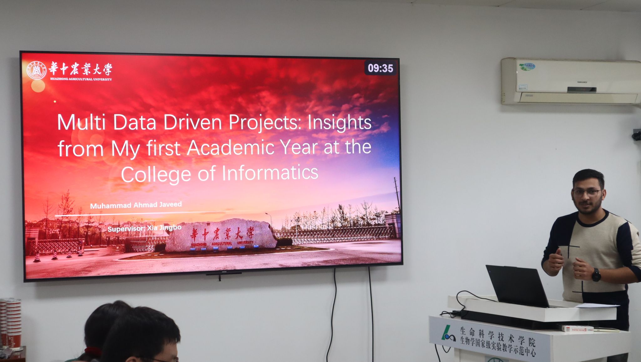 (文字|刘婧华 图片|刘婧华 审核|刘洋)11月9日下午2:30,华中农业大学农业生物信息湖北省重点实验室2025年学术年会暨信息学院2025年研究生学术年会在第一综合楼举行。本次年会以“展示科研成果、促进学术交流”为核心,设置PPT汇报和墙报展评两个环节,设有生物信息学、数学、计算机科学与技术三个分会场。华中农业大学信息学院冯在文副教授、李伟夫副教授、刘世超副教授分别担任各分会场主持人,华中农业大学信息学院张红雨教授、武汉双绿源创芯科技研究院有限公司董事长周发松研究员、中国科学院水生生物研究所夏晓勤研究员、湖北大学邹斌教授、华中科技大学唐厂教授等老师担任评委。