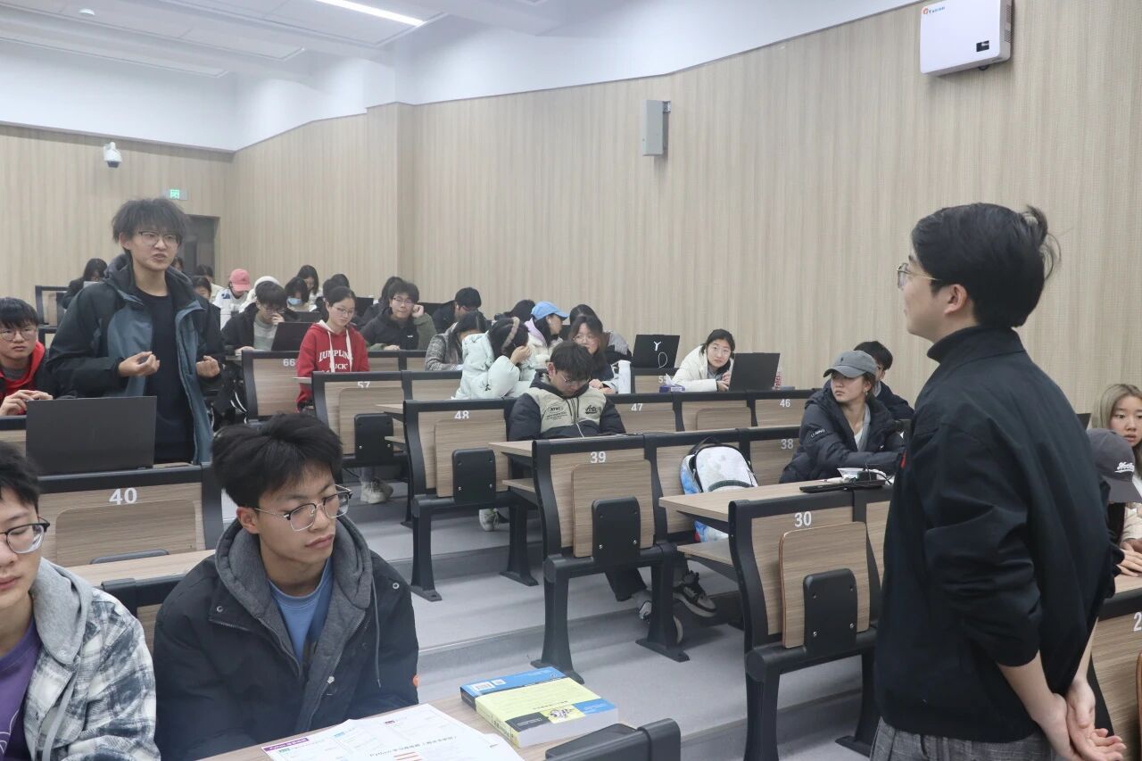 王成然则以“从敢表达到善表达”为主线,通过四个部分内容分享沟通与演讲的技巧。首先,他从台风塑造与情感共鸣入手,讲解如何通过姿态、眼神与情绪传递,提升台上的表现力与感染力。随后,他结合声乐技巧讲解发声基础,包括呼吸方法、音量控制与语速调节。在内容组织与临场应变方面,他重点强调了逻辑梳理、语言凝练和结构清晰的重要性。最后,王成然带领全体同学一起进行了呼吸与发声的跟练,帮助大家在实践中掌握音量控制与语速调节的技巧。