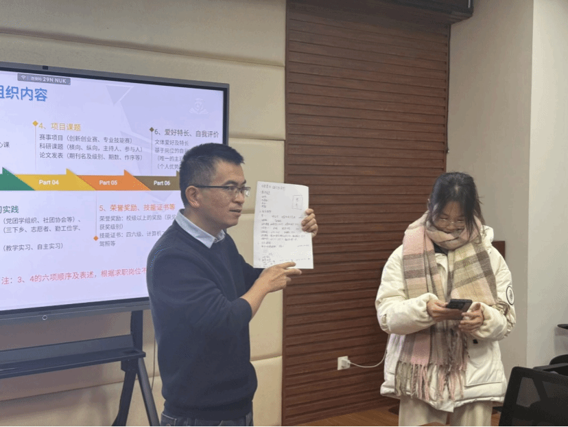 在理论讲解过后,穆老师通过发放简历纸,引导在场同学进行简历撰写和实战点评。穆老师还重点介绍了STAR法则,强调要用数据说话,例如将“熟悉Office软件”改为“精通PPT数据可视化”等,以具体量化的成果代替模糊描述。