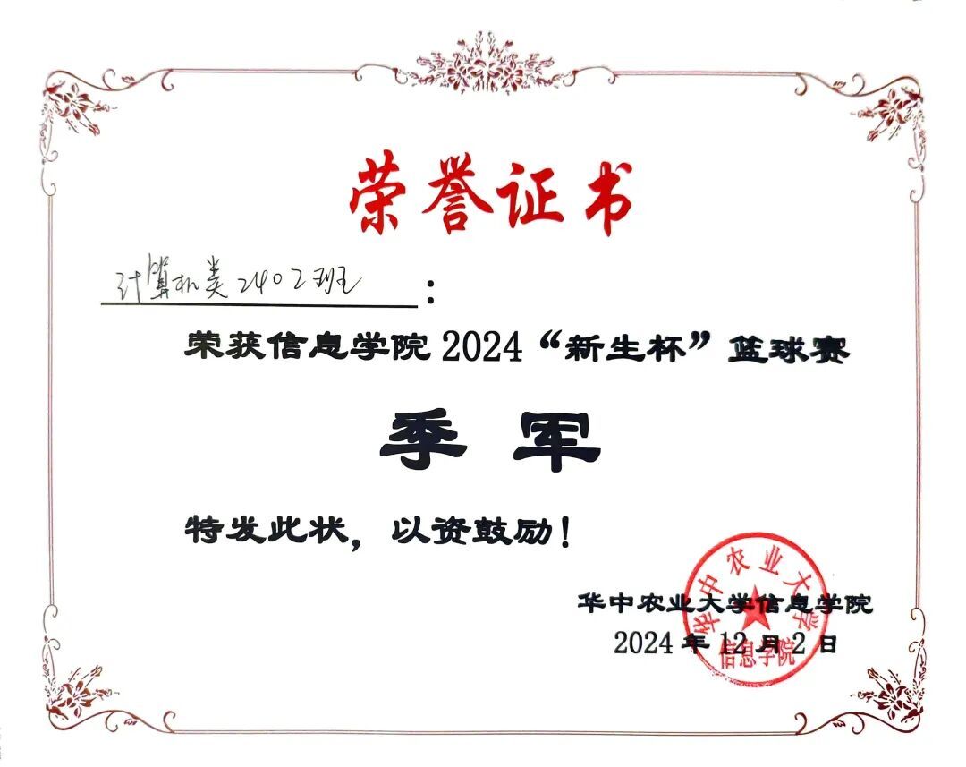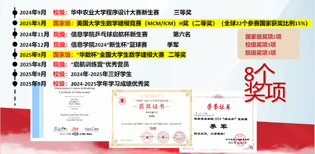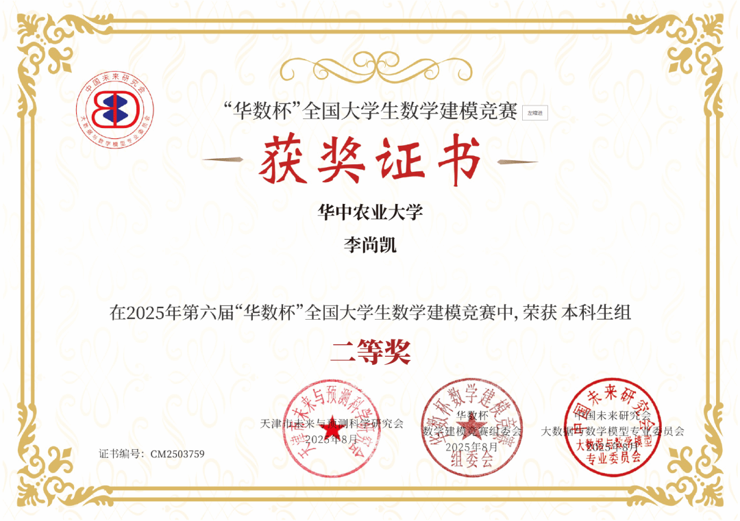 努力晨昏事,躬行味始长。李尚凯在学习之余,也积极参与各类竞赛。2024 年 9 月,参与了校级竞赛华中农业大学程序设计大赛新生赛,获得了三等奖,在2025 年先后获得美国大学生数学建模竞赛H 奖, “华数杯” 全国大学生数学建模大赛本科生组二等奖。