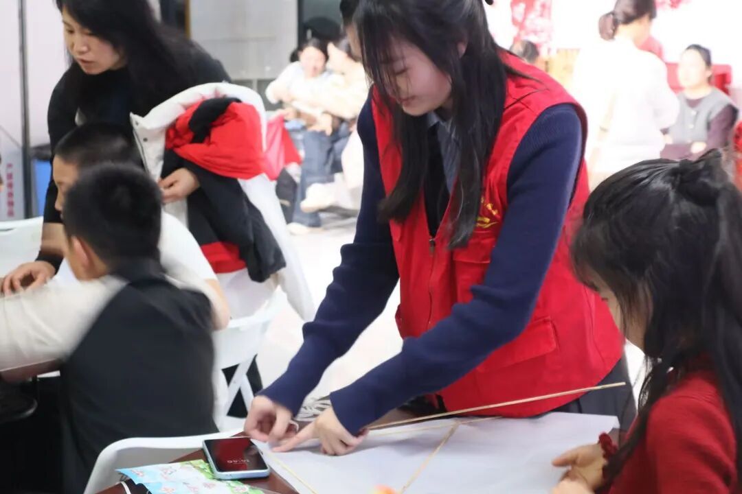 紧接着竹蜻蜓制作环节正式开启。志愿者们手持制作材料,为小朋友清晰演示竹蜻蜓的制作流程:木制叶片交叉摆放,转轴与手柄精准组装,用胶水固定牢固。演示结束后,孩子们纷纷拿起材料动手尝试,遇到难题时抬头向身边志愿者求助。当一个个专属竹蜻蜓初具雏形,跃向空中,旋起优美的曲线时,现场满是孩子们的欣喜欢呼,笑容洋溢在每个人脸上。