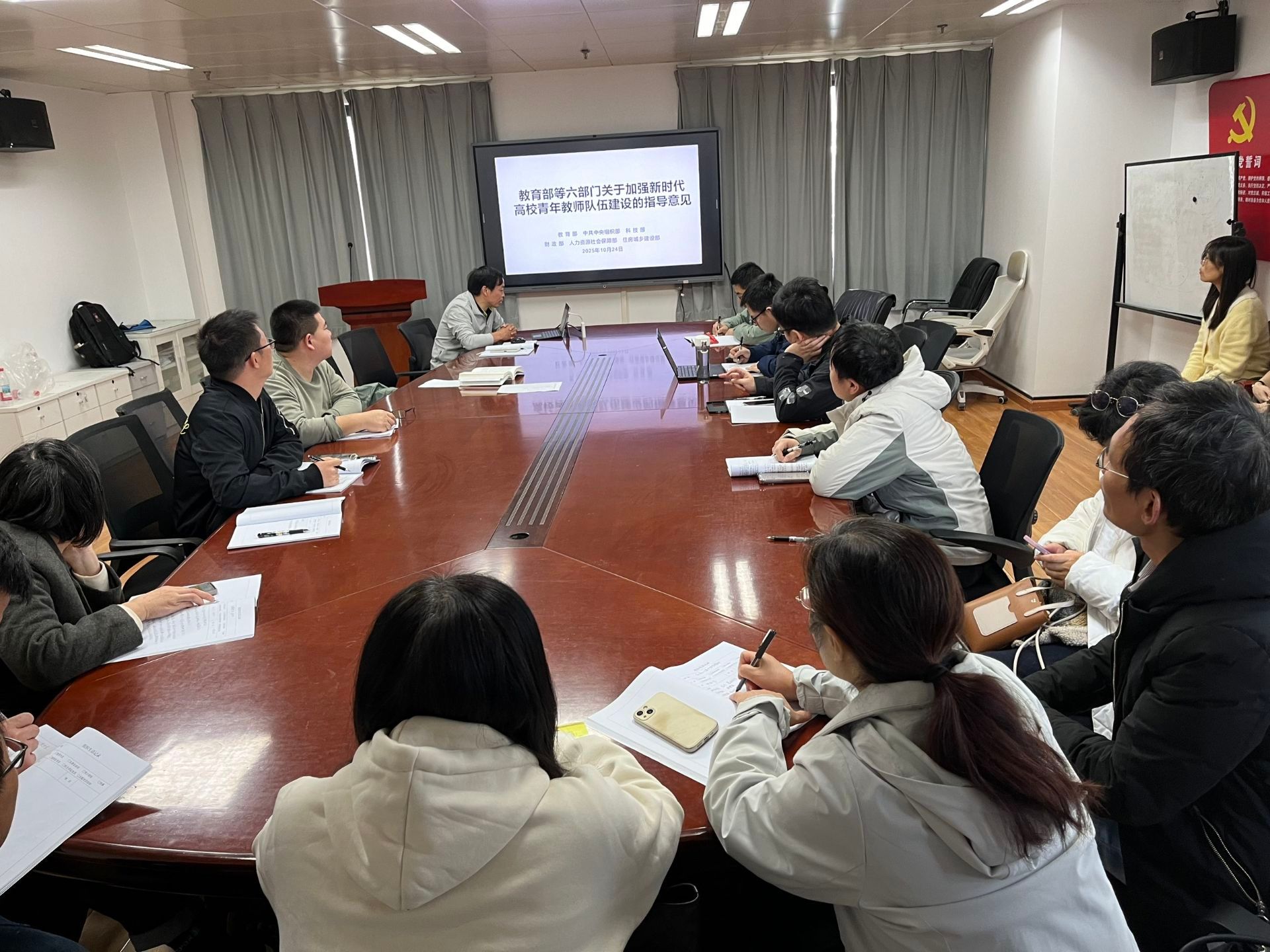 部分党支部结合专业、学科建设实际,重点研学了《教育部等六部门关于加强新时代高校青年教师队伍建设的指导意见》,部分党支部组织了对中央宣传部、教育部联合制作的《闪亮的名字——2025最美教师发布仪式》专题电视节目的集中收看学习。