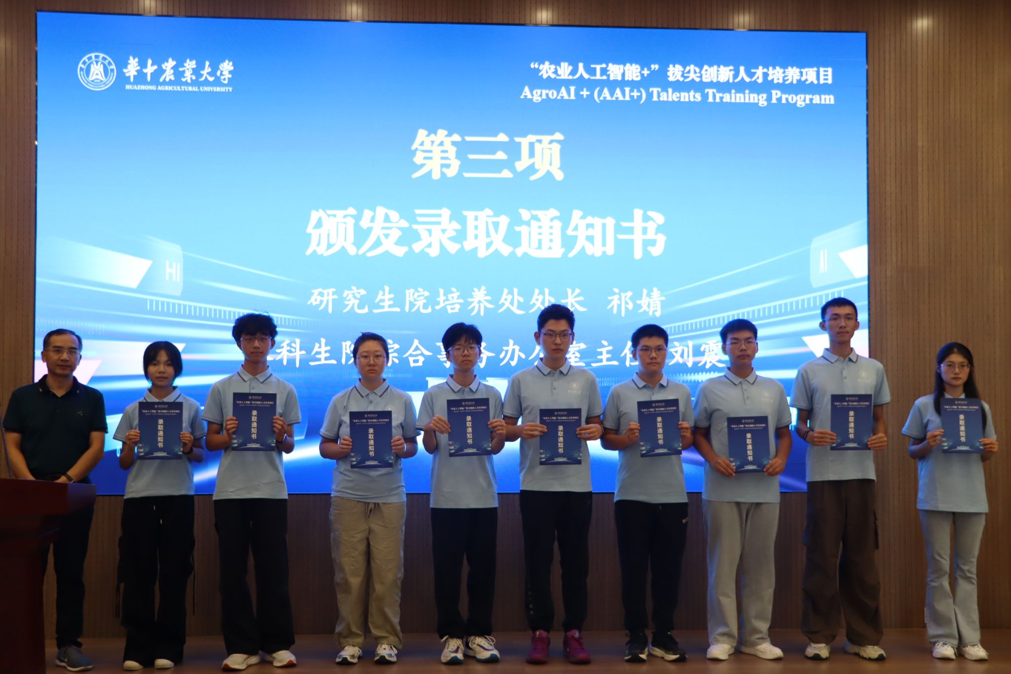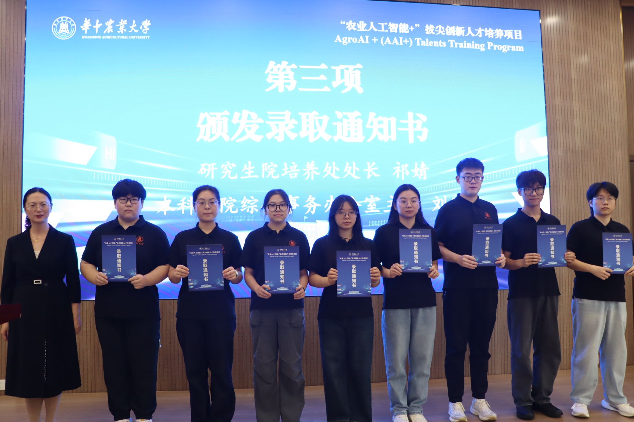 “农业人工智能+”拔尖创新人才培养项目(AgroAI+ Talents Training Program)(简称AAI+)是落实学校第十一次党代会精神,加速推进人工智能与农业、大生命科学的深度交叉融合,培养一批“人工智能+农业”学科交叉拔尖创新人才的战略举措。围绕农业科学某一学科领域的真实科学问题或产业问题为选题,突出“基础知识+底盘技术+场景应用”的融合创新,开展以农业应用场景驱动的项目制本博贯通一流人才培养模式,培养学生利用人工智能解决农业应用场景实际问题的创新能力。该项目实施“交叉性、个性化、场景化”的教育教学,以“农业人工智能+”交叉项目为基础遴选指导教师,全程实施导师组指导,每位研究生至少配备1名信息学院导师和1名相关农业、生命学科的导师,开展交叉课题研究。该项目自今年上半年启动以来,已陆续通过考核遴选了21名硕博连读转博生、30名推免直博生。2025级本科新生入学后,该项目经过宣讲报名、资格审查和初筛、笔试、面试和公示等环节,面向全校择优遴选了56名学生组建了2025级农业人工智能+两个本科班级。
