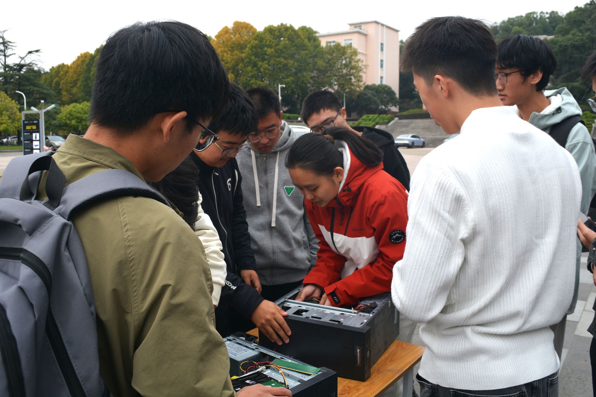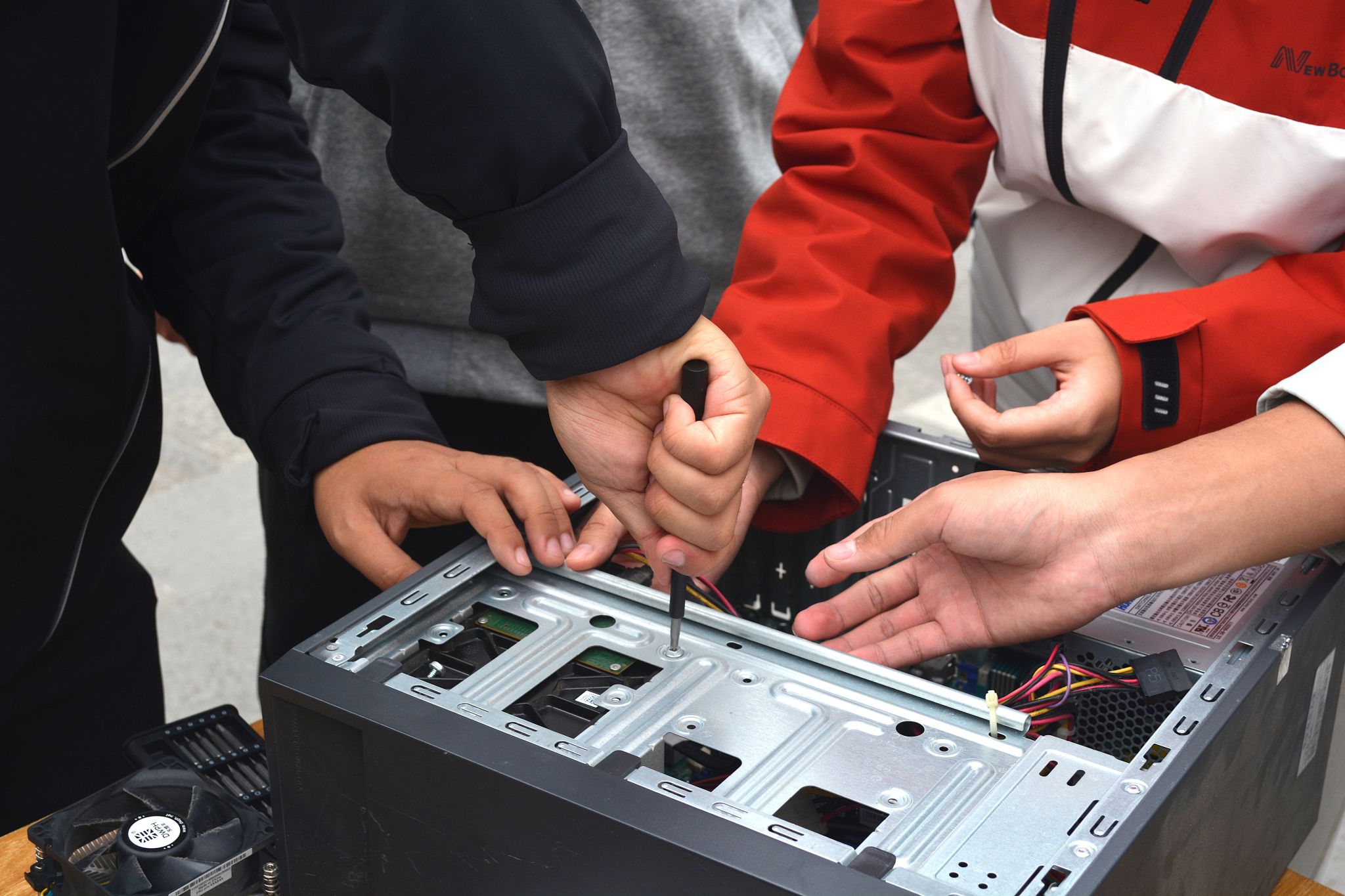 随后,参与者们开始动手操作:拆开电脑主机,近距离观察主板、CPU、内存、硬盘等核心部件的外观与连接方式。过程中,同学们互动频繁:“这个内存条怎么区分正反面?”“硬盘接口不同会影响传输速度吗?”志愿者在耐心解答疑问的同时,还现场讲解了不同种类显卡的功能与特点。拆机组装完成后,工商2502班徐艺谈道:“以前只知道用电脑打游戏、写代码,今天亲手拆开才明白里面的构造这么精密。”
