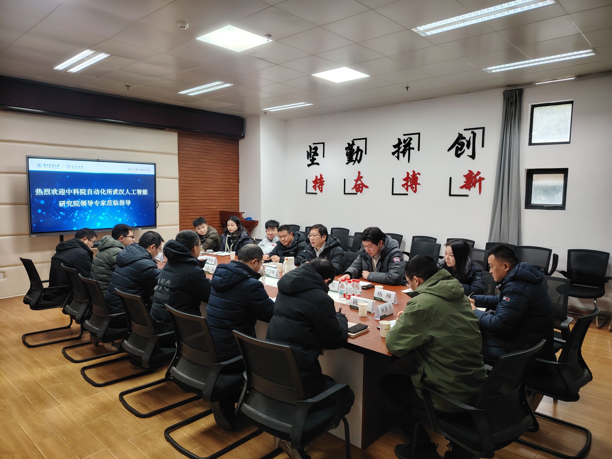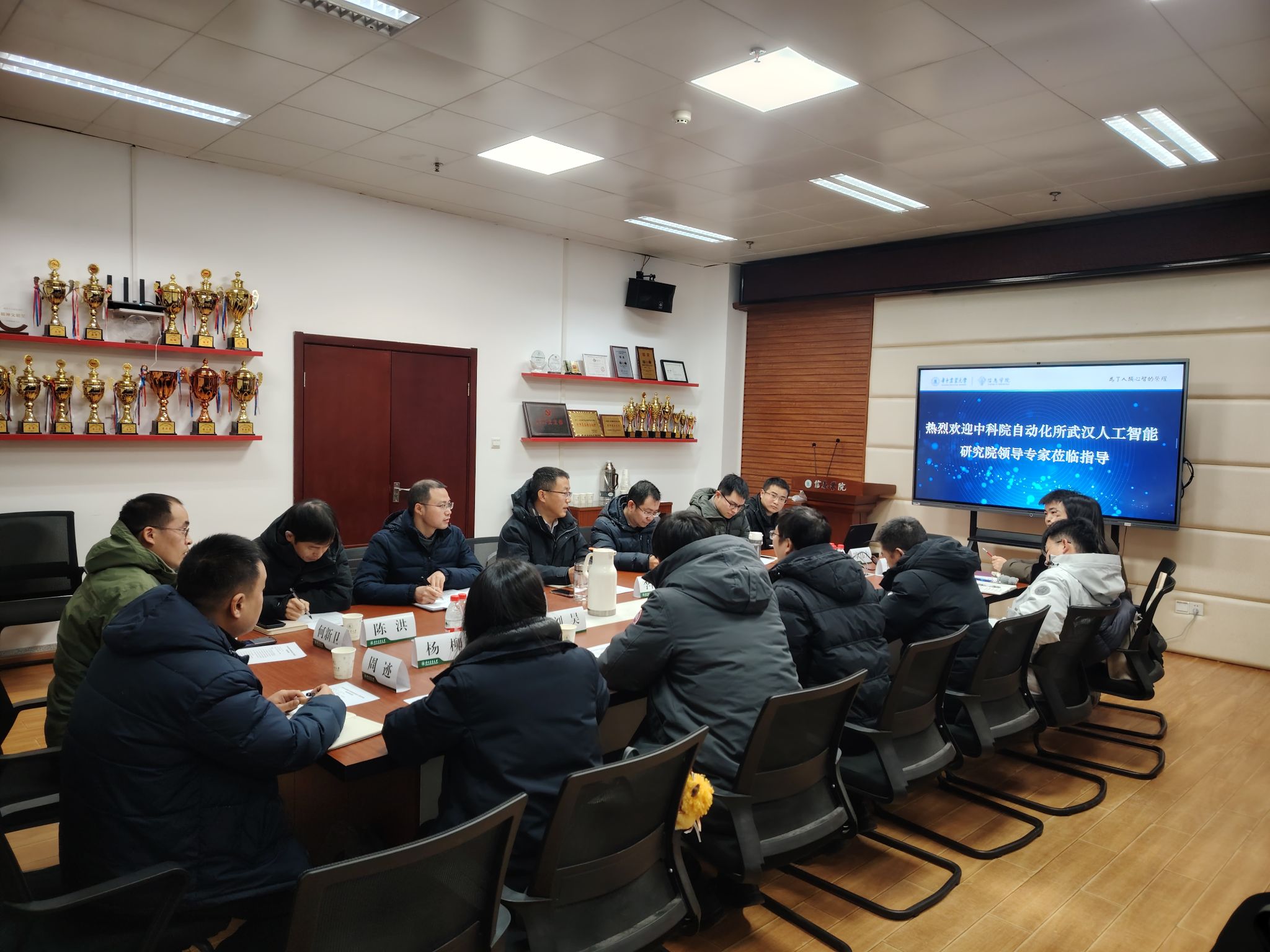 中科院自动化所武汉人工智能研究院研究员王勇、院长助理刘昊、副研究员刘智威、 双创运营经理杨柳、解决方案架构师王瑾、 高级商务经理周迹、科研助理安泓岩,以及信息学院党委书记向异之、副院长朱容波、王玉龙,人工智能系主任沙灜教授,数学与统计学系陈洪教授、骨干教师李伟夫副教授,人工智能系骨干教师何新卫副研究员,计算机科学系骨干教师冯在文副教授等参加座谈交流。