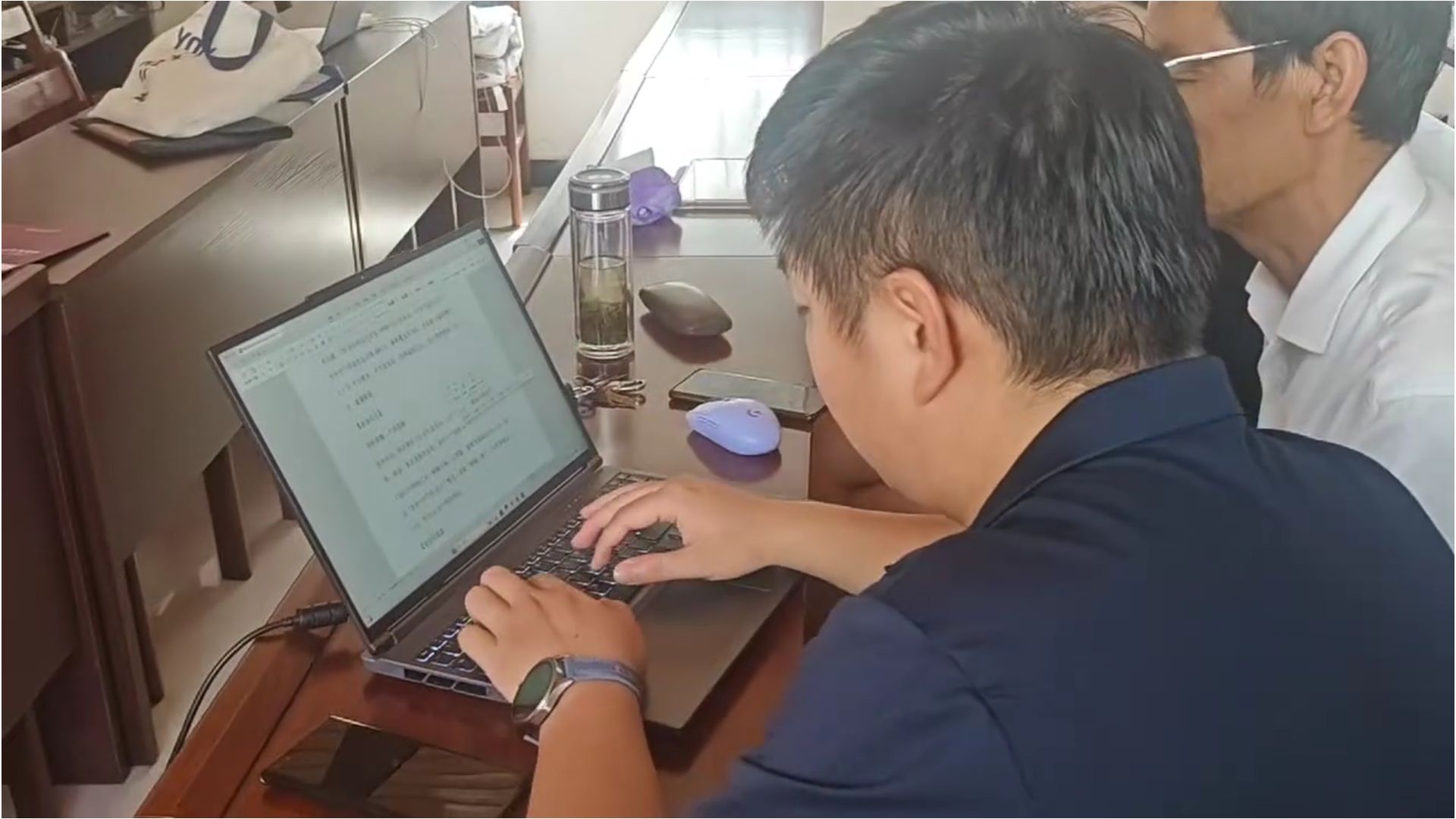 (团队成员与书记周德智校验核对天堂村简介和产业报告)