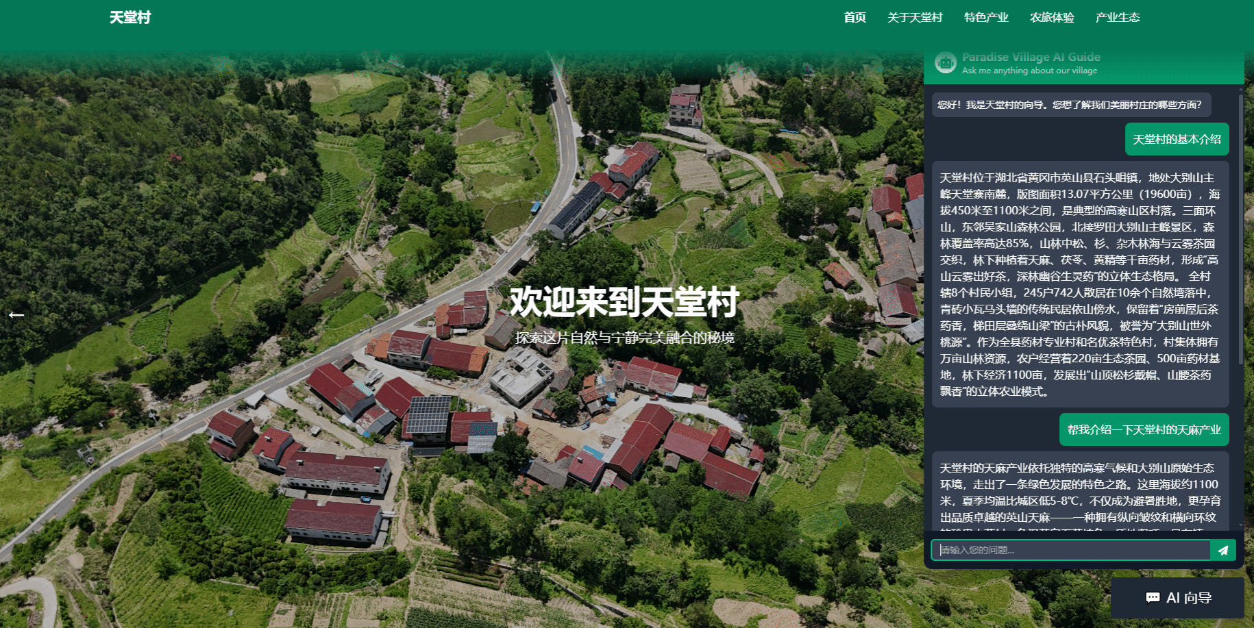 基于调研成果,团队撰写了万余字的天堂村简介和产业报告,涵盖天堂村简介、天堂村种植的药材和茶叶详情、天堂村现有公司简介、天堂村校企合作典型案例、天堂村农旅报告等5个方面。基于调研报告和天堂村数智化的需求,团队成员充分发挥专业优势,帮助建立天堂村智能门户网站“云上天堂”:绘制产业地图,可视化呈现8个村民小组的茶田、药田、民宿点位;打造农旅服务枢纽,集成茶药订购、民宿预订、接待预约等功能;建立天堂村中药材百科库,收录天麻、石菖蒲、茯苓、黄精等4类道地药材的种植工艺、药用价值及采收季信息。同时,团队还训练、测试并部署了天堂村专属的AI问答大模型,解答游客关于天堂村的各类问题。