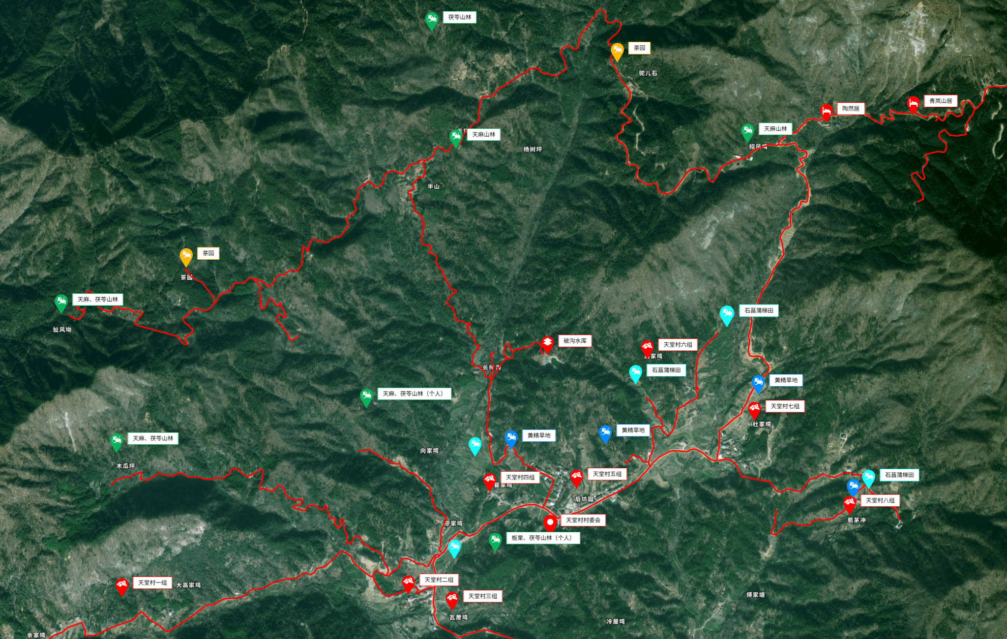 通过实地走访天堂村8个村民小组,并采访周维等7位村民,团队与村民深入交流了产业变革对乡村和家庭的改变,了解了天堂村信息技术的水平和需求。团队还收集了村民对药材溯源、农产品销售和农旅推广的数字化需求。基于天堂村对农旅的需求,团队全景记录了青岚山居和陶然居等地方民宿、高山梯田和河流森林等自然景观,并标注210亩生态茶园与千亩药材基地的空间分布。
