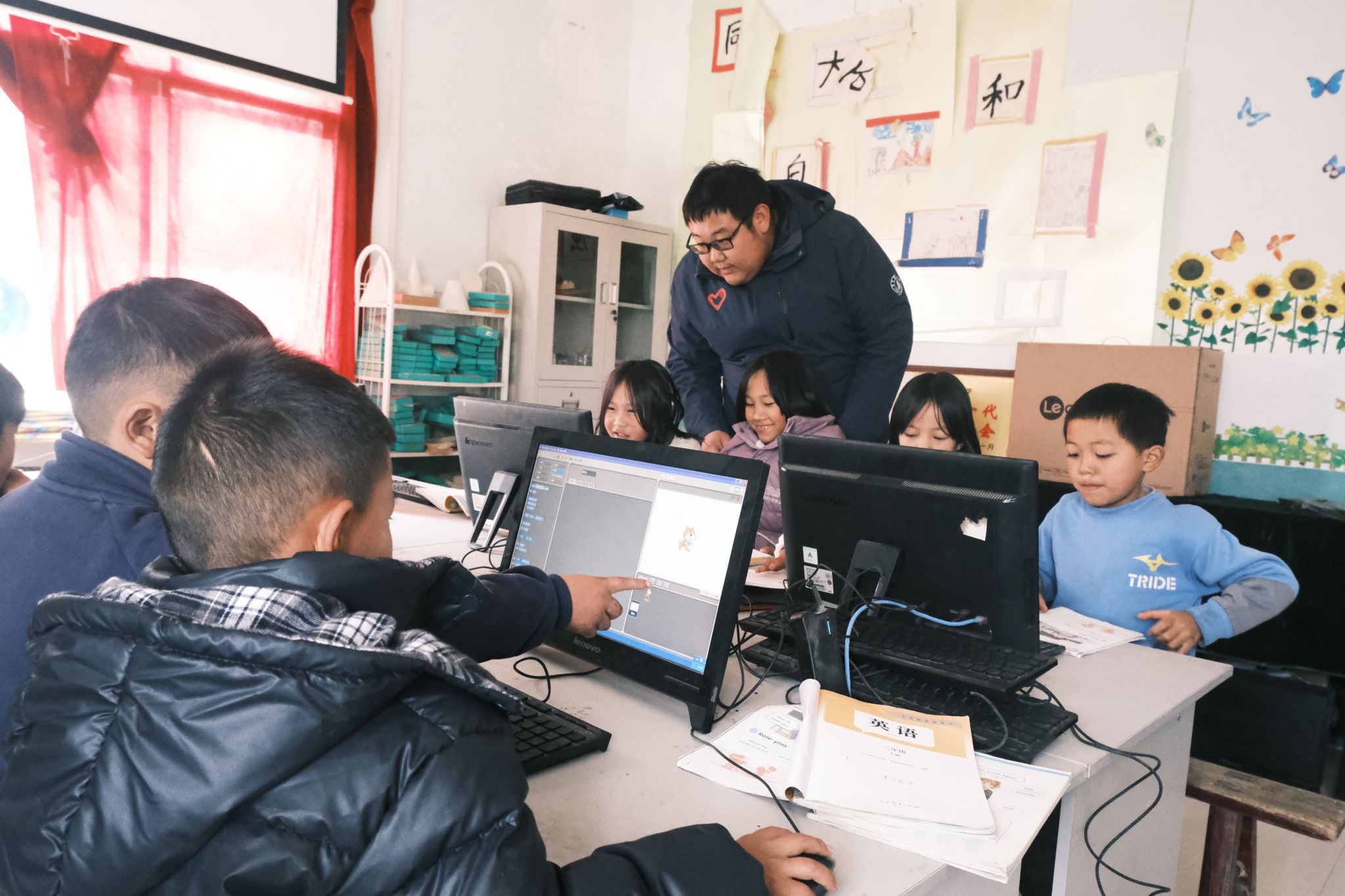 “孩子们对计算机基础操作相对陌生,绝大多数孩子都是第一次握鼠标。”为了让这批优质的数字化课程真正落地,支教团成员彭澍荣老师在课堂上化身“全能教练”。